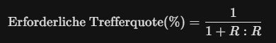 Bei 1:1 (Riskierst 1 €, gewinnst 1 €): 1 / (1+1) = 0.5 → 50%